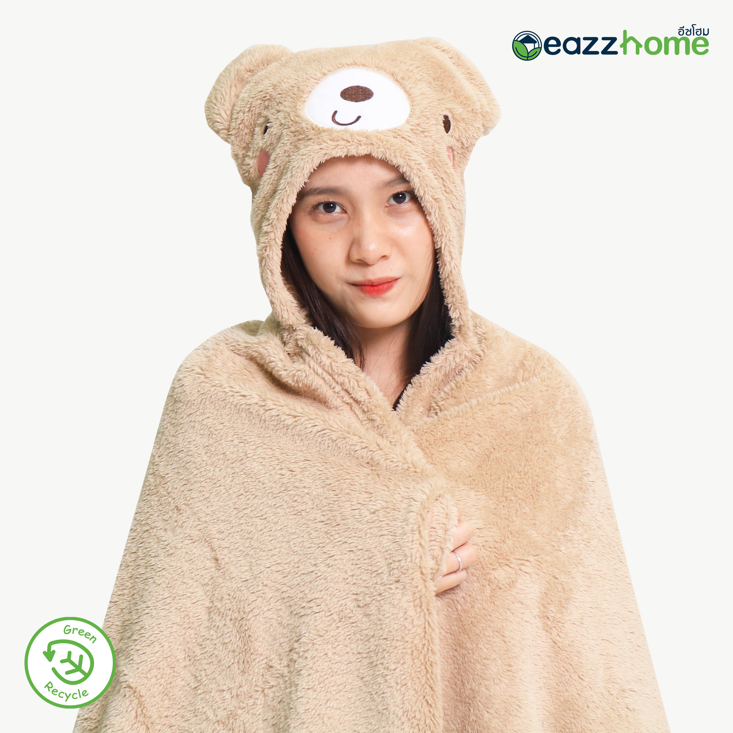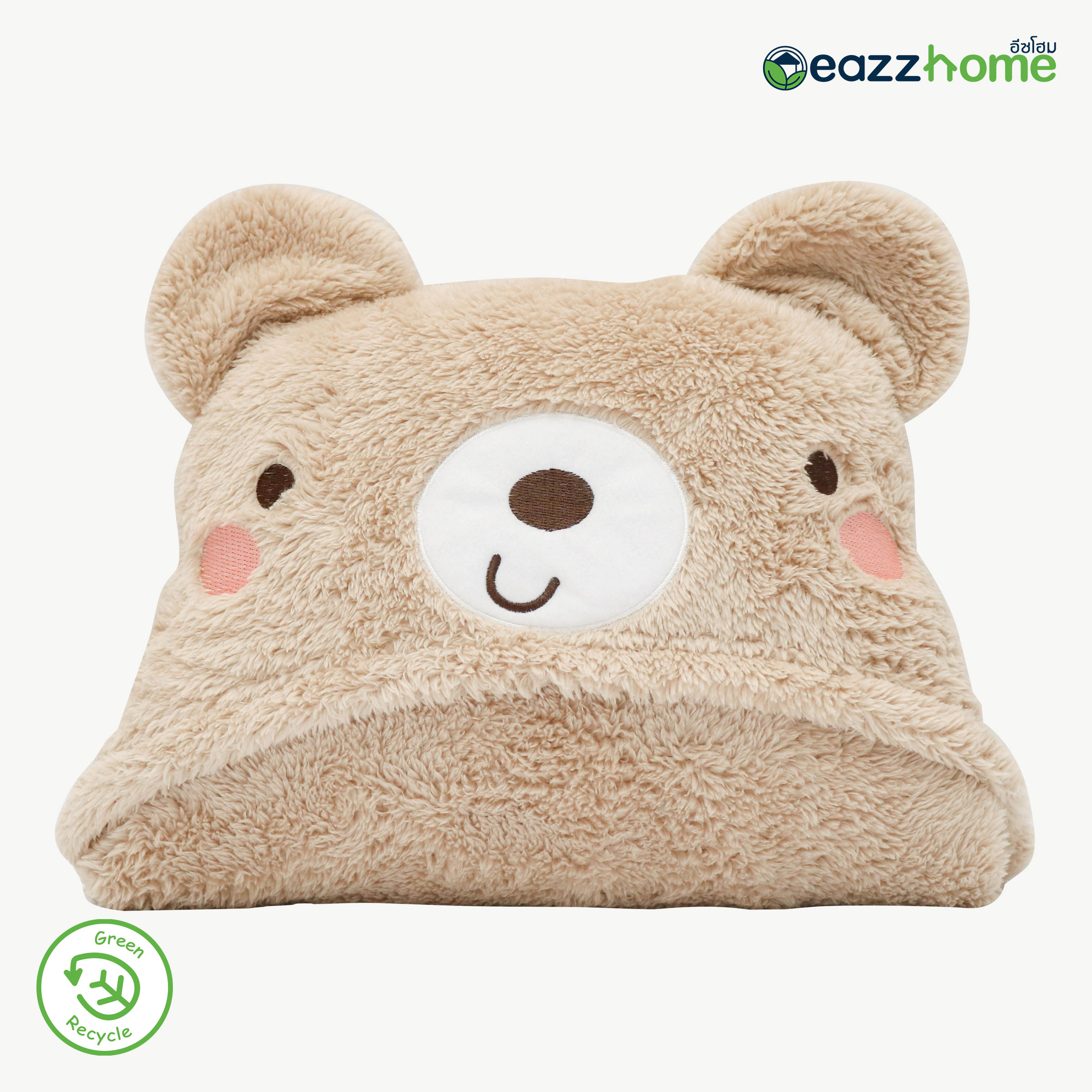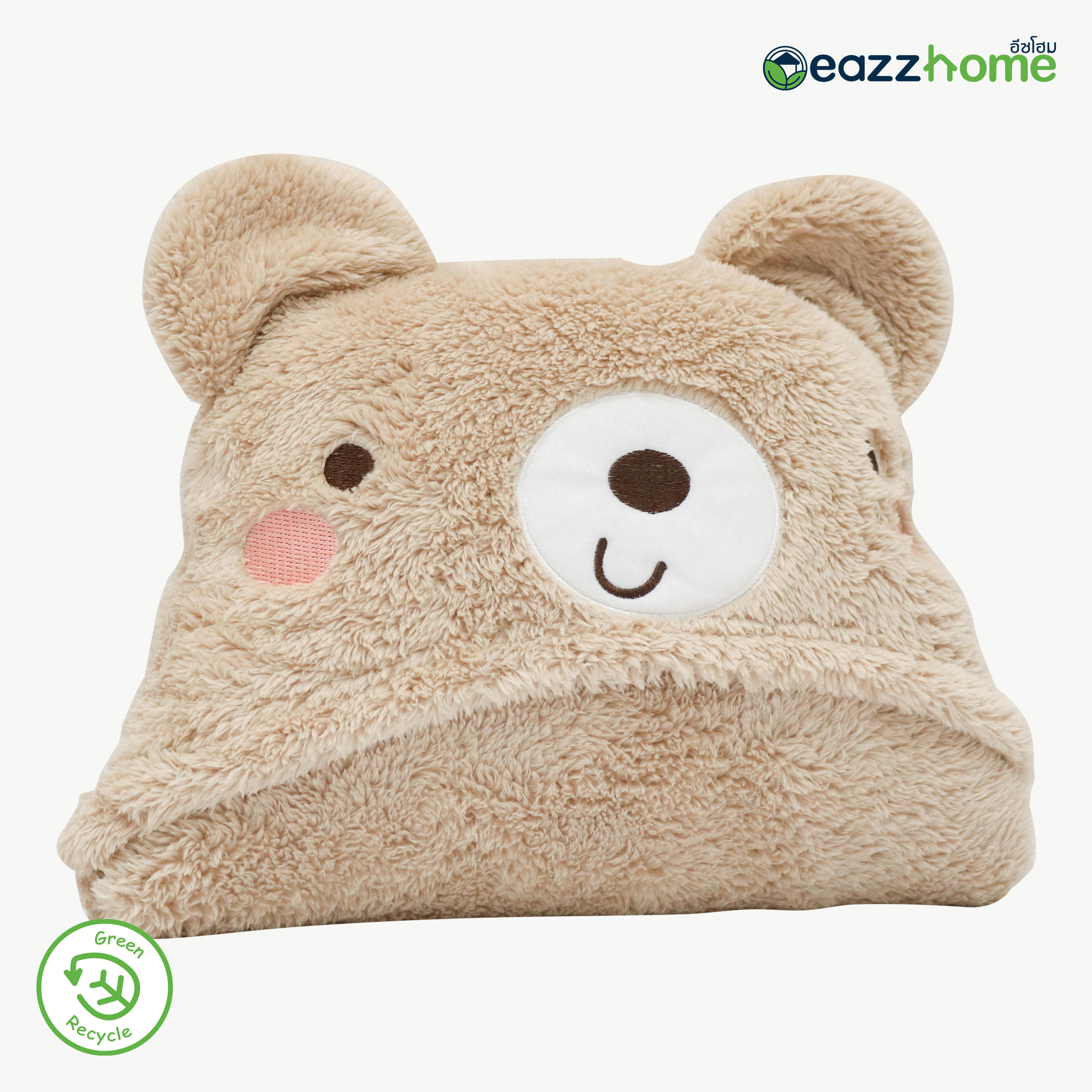 Partially Recycled Polyester Hooded Plush Blanket with Bear Design, Beige