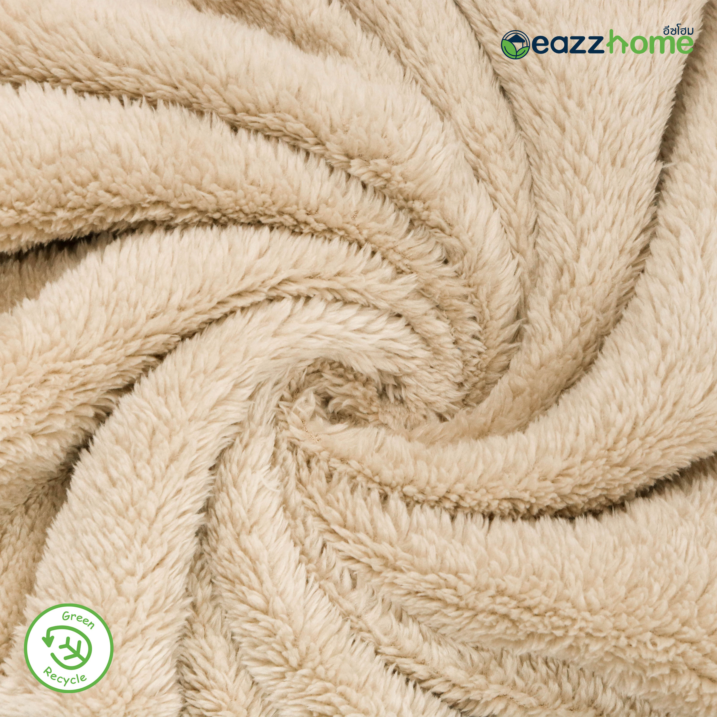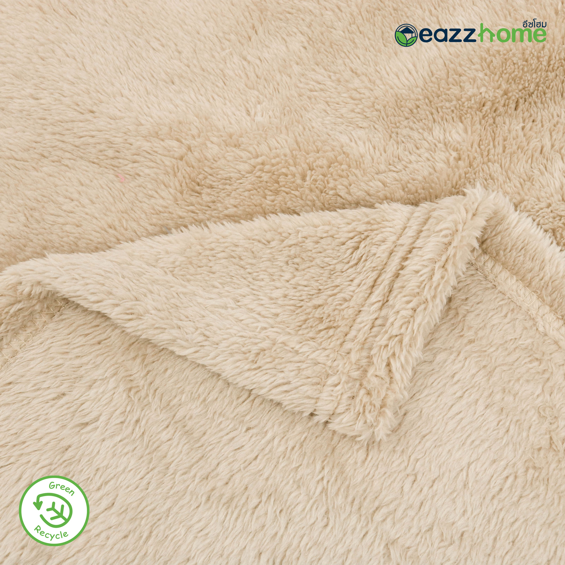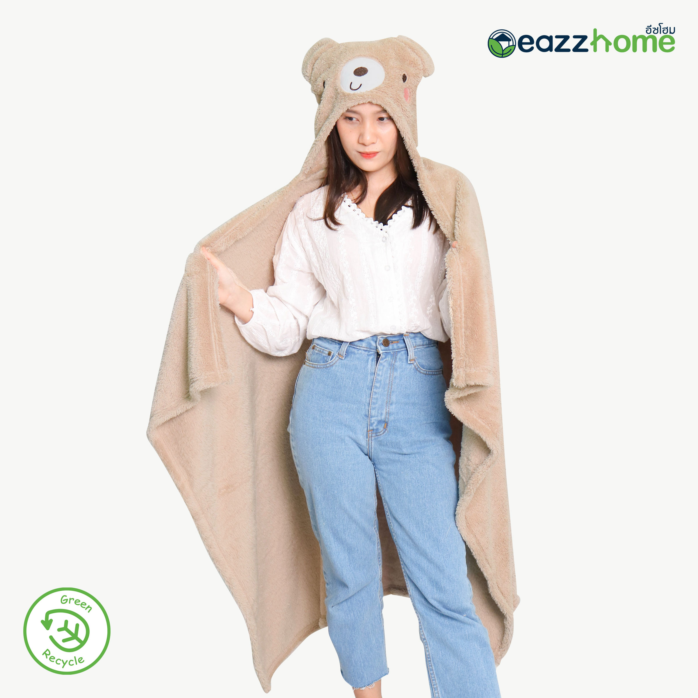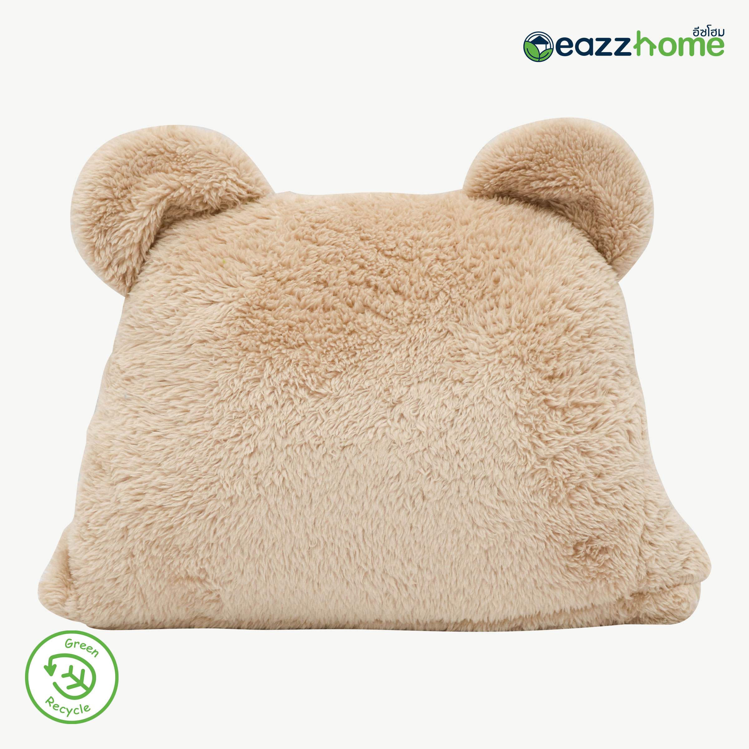 Partially Recycled Polyester Hooded Plush Blanket with Bear Design, Beige